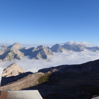All is quickly forgotten with sunrise. We step to the windows and see a sky that looks like a white down comforter had been used to tuck the earth in last night. Only Triglav (the three-headed mountain) and its fingers of lesser peaks poke over the top into the clear blue sky. Known as a cloud inversion only the lucky few of us shared in the sun that morning while the villagers and tourists below shared in gray and gloomy skies.